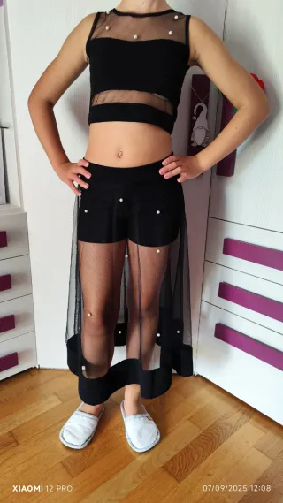 Bellissimo completino per bambina di 14 anni, composto da top e gonna. Il top è di colore azzurro cielo, a maniche corte, con dettagli a volant sulle spalle. La gonna è a ruota, con una deliziosa stampa a fiorellini azzurri e bianchi. Perfetto per l'estate! - Top in tessuto a costine, leggero e fresco. - Gonna con stampa floreale, morbida e vaporosa. - Ideale per occasioni speciali o per tutti i giorni.
