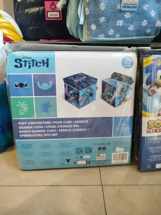 Pouf contenitore a tema Disney Stitch, perfetto per riporre oggetti. - Design con Stitch e dettagli blu. - Dimensioni: L30cm x W30cm x H30cm. - Materiale: Tessuto resistente.