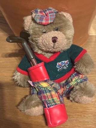 Peluche a tema golf Gordon della collezione The Teddy Bear. - Orsetto con abbigliamento da golf. - Cappellino a quadri. - Include sacca da golf con mazze. - Misura 18 cm.