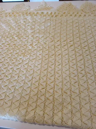 Copertina fatta a mano all'uncinetto, ideale per lettini da bambino. Il design presenta un motivo a rombi in rilievo con una bordatura lavorata. In lana Misure 130 x 160 - Colore avorio. - Morbido filato. - Finitura artigianale.