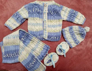 Set completo in lana per neonato, ideale per tenere al caldo i più piccoli. Il set include diversi capi coordinati. - Cardigan con bottoni e dettagli a trecce. - Cappellino abbinato con pompon. - Scarpine morbide con nastrini. - Sciarpa calda e avvolgente. Molto bello! Segnalo che uno dei bottoni è un po' sciupato essendo stato fatto a découpage. Lavato e profumato.