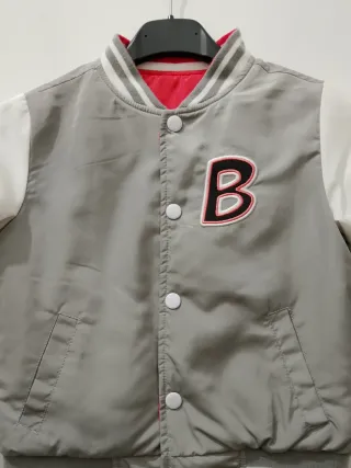 Giubbotto per bambino double face, perfetto per ogni occasione. - Un lato grigio con maniche bianche e ricami. - L'altro lato è rosso. - Chiusura con bottoni a pressione.