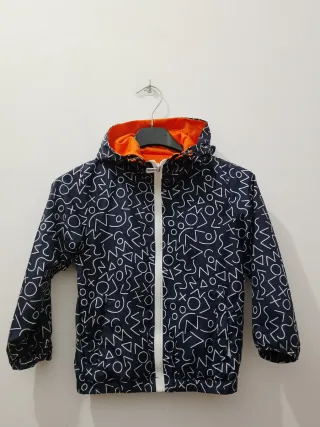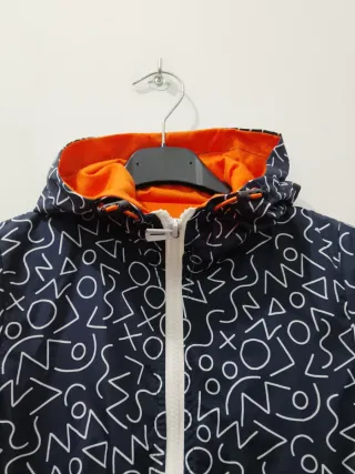 Giubbotto antivento per bambino con una divertente fantasia. - Fantasia con forme geometriche bianche su fondo blu scuro. - Interno foderato in colore arancione vivace. - Cappuccio integrato. - Chiusura frontale con zip bianca.