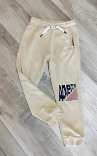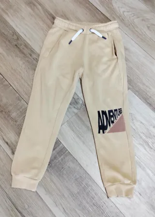 Pantalone tuta color beige per bambino, taglia 9/10 anni. Presenta una stampa Adventure sul lato. - Vita elasticizzata con laccetti bianchi. - Tasche laterali. - Fondo gamba elasticizzato.