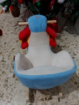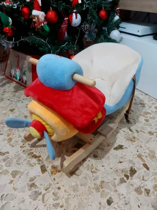 Dondolo a forma di aereo, realizzato in morbido peluche e legno resistente. Con cintura di sicurezza per una maggiore protezione. Emette varie melodie. - Seduta imbottita per il massimo comfort. - Manici in legno per una presa sicura. - Base in legno per dondolare.