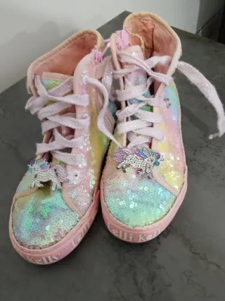 Scarpe da ginnastica alte per bambina, decorate con paillettes cangianti e applicazioni a forma di unicorno. - Chiusura con lacci e zip laterale. - Dettaglio logo Kelly sul fondo. - Numero 29