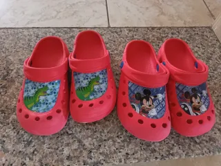 Coppia di Crocs per bambini in colore rosso, con divertenti stampe. - Un paio con dinosauri verdi. - Un paio con Topolino.