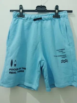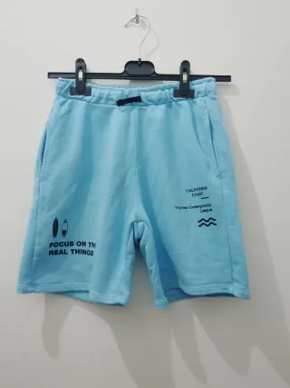 Pantaloncini comodi e alla moda per bambino, colore azzurro. - Stampa California Coast e The New Underground League. - Stampa Focus on the Real Things con disegno di tavole da surf. - Vita elasticizzata con laccetto.