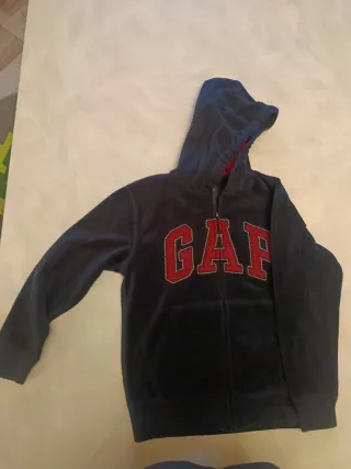Pile felpata blu con cappuccio e zip, logo Gap rosso sul davanti. - Materiale morbido e confortevole. - Design con cappuccio. - Chiusura con zip frontale. - Logo Gap a contrasto.