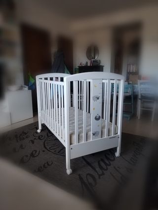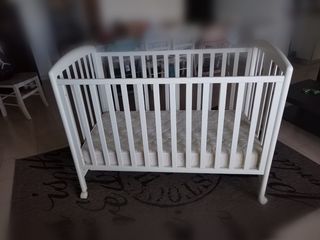 Vendo lettino in legno come in foto, con una sponda fissa e una regolabile e rete a doghe in legno di faggio. Dimensioni: 131x71x103 cm. Materasso incluso. Presenti piccole imperfezioni alla vernice. Smontato. Consegna a mano zona Guidonia (RM).