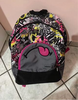 Zaino colorato con stampa graffiti e faccina Smiley. - Design vivace e originale. - Tasca frontale con zip. - Spallacci regolabili.