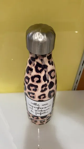 Borraccia termica Le Pandorine con fantasia leopardata. La frase nelle mie imperfezioni c'è qualcosa di perfetto è stampata su un'etichetta bianca. - Fantasia leopardata. - Frase nelle mie imperfezioni c'è qualcosa di perfetto. - Logo LE PANDORINE sul fondo. segni di usura sul fondo come in foto!