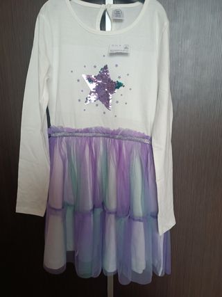 Vestito bimba 8/9 anni (134 cm) con paillettes reversibili a forma di stella. Gonna in tulle. Chiuso sul retro da bottoncino. 100% cotone. Marca Little Kids. Nuovo, ancora con cartellino attaccato.