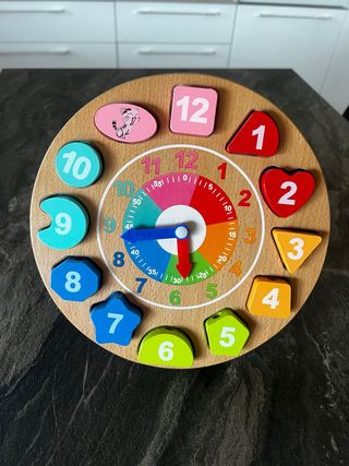 Bellissimo orologio didattico in legno per bambini, colorato e in ottime condizioni. - Gioco educativo per imparare a leggere l'ora. - Numeri e forme colorate. - Perfetto per bambini dai 3 anni in su. - Realizzato in legno resistente.
