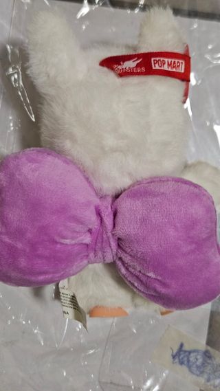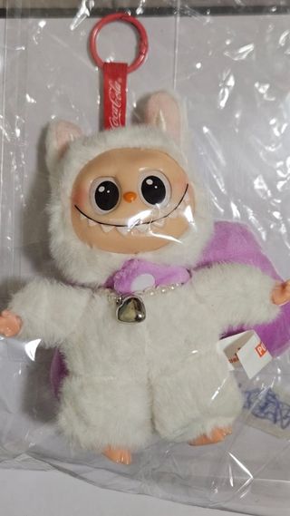 Portachiavi a forma di pupazzo Labubu, in collaborazione con Coca Cola. Il pupazzo è bianco con dettagli rosa. - Dettagli in peluche bianco. - Orecchie e dettagli rosa. - Ciondolo a forma di campanella. - Laccetto con logo Coca Cola.