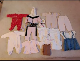 Lotto di vestitini per neonata, taglia 1-3 mesi. - Tutina rossa a pois bianchi. - Completo rosa con felpa e pantaloni. - Tutina bianca. - Cardigan rosa. - Body bianchi. - Salopette in denim.