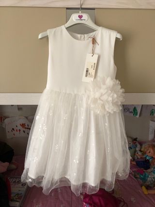 Elegante abito bianco per occasioni speciali, taglia 4 anni. - Tessuto leggero e impalpabile. - Dettaglio floreale applicato sul fianco. - Gonna in tulle con paillettes scintillanti.solo lavato mai usato
