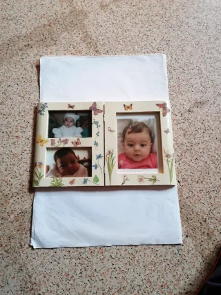 Portafoto a libro decorato con farfalle e fiori. - Cornice a libro. - Decorazioni a tema farfalle e fiori. - Spazio per più foto.