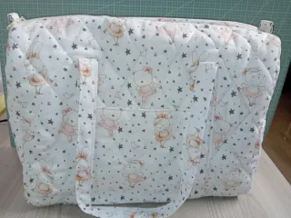 Set coordinato composto da borsa e fasciatoio, ideale per i più piccoli. Il tessuto presenta una stampa colorata con orsetti e coniglietti che danzano tra stelle e cuoricini. - Borsa trapuntata con fantasia. - Fasciatoio coordinato. -Borsa portapannolini e salviette