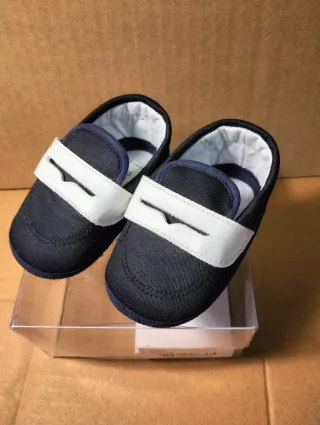 Bellissime scarpette per neonato firmate Gianfranco Ferrè. - Colore blu navy con dettaglio bianco. - Chiusura a strappo. - Interno foderato in tessuto..