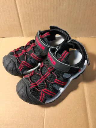Sandali da trekking Vitike per bambino, perfetti per l'estate. Sono in ottime condizioni. Taglia 26-27 (misura tacco punta 17cm) - Colore: nero e rosso - Chiusura con velcro - Suola antiscivolo - Ideali per attività all'aperto