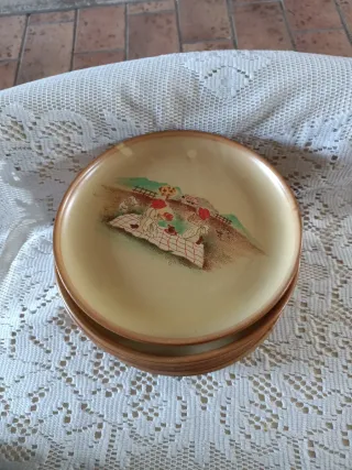 Set di sei piatti con un grazioso disegno di bambine. Cm21. - Decorazione con bambine e paesaggio. - Bordo colorato.