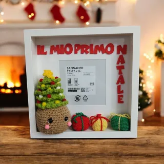 Bellissima cornice Il mio primo Natale decorata a tema natalizio. Perfetta per conservare un ricordo speciale. - Decorazione con albero di Natale all'uncinetto. - Include tre piccoli pacchi regalo all'uncinetto. - Scritta Il mio primo Natale in lettere rosse. misura totale cornice 27x27 Decorazioni realizzate a mano con tecnica amigurumi. La cornice si può appendere alla parete o appoggiare su un ripiano. Cornice disponibile in colore bianco e abete naturale