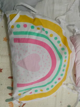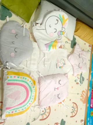 Set composto da paracolpi e sacco nanna per culla. - Paracolpi con fantasie a forma di nuvola, unicorno, arcobaleno e gatto. - Sacco nanna coordinato con fantasia unicorno. - Realizzati in tessuto morbido e traspirante.
