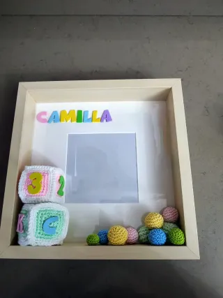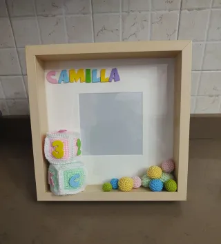 Realizzo Cornici portafoto personalizzate con tecnica amigurumi Ideale per conservare ricordi speciali. cornice colore bianco o rovere naturale misura 27x27 cm Si può appendere alla parete o appoggiare su un ripiano