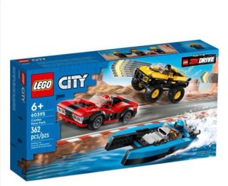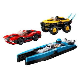 Set di tre veicoli Lego City, perfetto per collezionisti e appassionati. - Un'auto sportiva rossa con dettagli neri. - Un fuoristrada giallo con dettagli neri. - Una barca veloce blu con dettagli grigi.