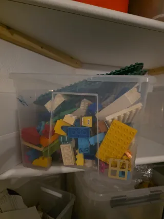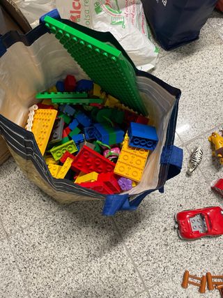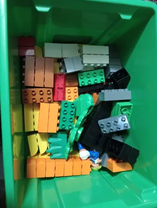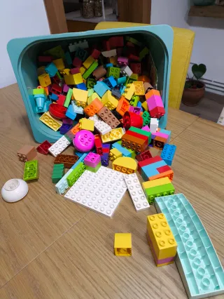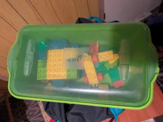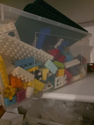Scatola di gioco Lego Duplo con diversi mattoncini.