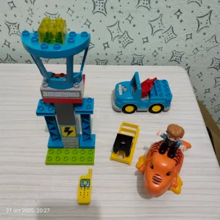 Set di costruzioni Jurassic World Lego Duplo. - Include una torre di controllo con dettagli. - Veicolo blu con carro attrezzi. - Figura di dinosauro arancione. - Figura del personaggio. - Telefono cellulare giallo. - Piattaforma gialla con dettagli neri.