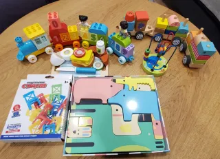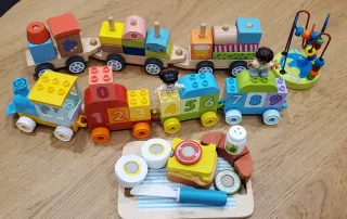 Set di giocattoli per bambini, ideale per stimolare la creatività e il gioco. - Treno in legno con vagoni impilabili (mancano alcune parti) - Treno di blocchi di costruzione con numeri Lego Duplo. - Figure di costruzione. - Set di cibo in legno con accessori. Alcuni in buono stato, alcuni con segni di utilizzo.