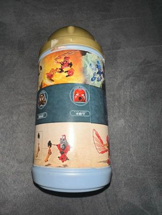 Contenitore rotondo per Lego Bionicle. Presenta illustrazioni colorate dei personaggi. Manca la maschera - Coperchio a cupola. - Base azzurra. - Grafica a tema Bionicle.
