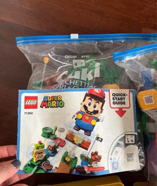 Lego assortiti misti. All’interno due set di Super Mario sono completi: - 71360 Starter Pack - 71368 La caccia al tesoro di Toad - Pack di estensione Entrambi contengono un qrcode per attivare il gioco online su APP. Le istruzioni invece sono disponibili online