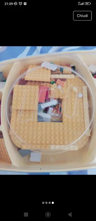 Scatola contenente una varietà di mattoncini Lego. - Pezzi di diversi colori e forme. - Ideale per costruire e creare. - Include pezzi gialli, rossi, bianchi e blu.
