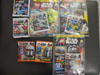 Lotto di riviste e bustine Lego Star Wars. - Riviste con fumetti e giochi. - Bustine con miniature e veicoli Lego. - Include: Resistance A-Wing, Jedi Interceptor, Republic Gunship, Palpatine's Shuttle, Clone Turbo Tank.