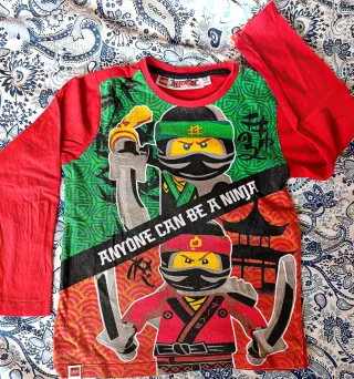 Maglietta a maniche lunghe per bambino Lego Ninjago. - Colore rosso con stampa fronte. - Personaggi Ninjago e scritta Anyone Can Be A Ninja. - Logo Lego sul fondo. Guarda foto etichetta per la taglia