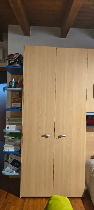 Armadio a ponte Moretti con mensole, ideale per camerette. - Struttura in legno chiaro. - Mensole a vista per libri o giochi. - Ante con maniglie integrate.