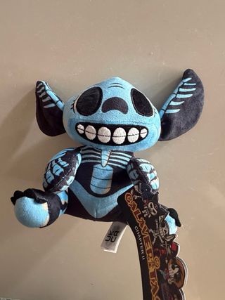 Peluche del personaje Stitch con un diseño inspirado en Calaveritos. Altezza circa 16 centimetri - Diseño de esqueleto en azul y negro. - Detalle de costuras y patrón óseo. - Etiqueta Calaveritas Chapter II visible.