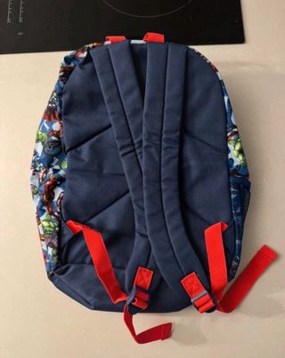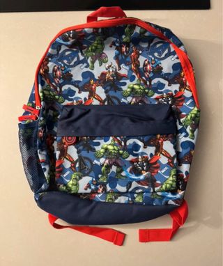 Zaino per bambini con stampa dei supereroi Marvel. - Personaggi: Hulk, Iron Man, Capitan America, Thor. - Colore principale: blu con stampa. - Dettagli rossi sulle cerniere e sui manici. - Tasca frontale con zip. - Tasca laterale in rete. Lo zaino non è ma stato usato ma come da foto ha una macchietta di sbiaditura sulla tasca davanti il resto è tutto in perfetto stato 40x36 centimetri