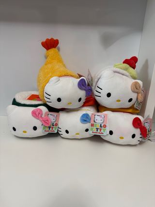 Set di 5 peluche a tema Hello Kitty Sushi Rolls. - Design ispirato ai rotoli di sushi. - Ogni peluche presenta un fiocco colorato. - Include un peluche a forma di gambero in tempura. Altezza 20 centimetri circa