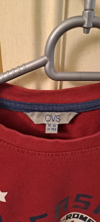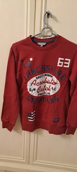 Felpa girocollo per bambino del marchio OVS. Taglia 12/13 anni - Colore rosso scuro. - Stampa a tema Lancashire Grappling sul davanti. - Dettagli con stelle e numeri 63. - Patch con bandiera americana sul fondo.