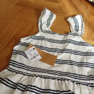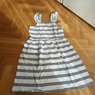 Vestito estivo per bambina in cotone a righe. - Fantasia a righe bianche e blu. - Spalline con volant. - Vita elasticizzata. Nuovo con cartellino.