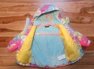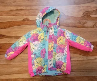 Giacca da sci CMP con una vivace fantasia colorata. - Taglia 86cm. - Fodera interna azzurra. - Maniche e inserti laterali in tinta fucsia.