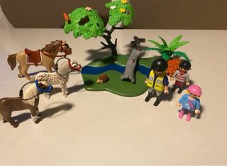 Set Playmobil Country con cavalli e personaggi. - Tre cavalli di colori diversi, uno con sella. - Tre personaggi con abbigliamento da equitazione. - Accessori come alberello, cespuglio e riccio.