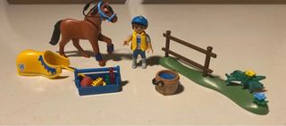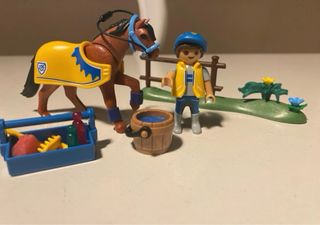 Set Playmobil con cavallino marrone e accessori per il gioco. - Cavallino con finimenti blu. - Bambino con caschetto e gilet giallo. - Carretto giallo. - Secchio con acqua. - Attrezzi strigliatura. - Recinto e fiori.