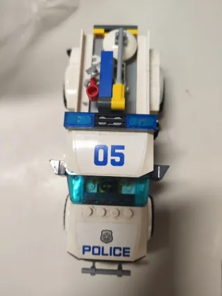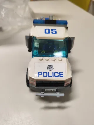 Set di modelli Lego di un'auto della polizia. - Veicolo bianco con dettagli blu. - Numero 05 sul tetto. - Scritta POLICE sul cofano. - Targhetta JC60045 sul paraurti.
