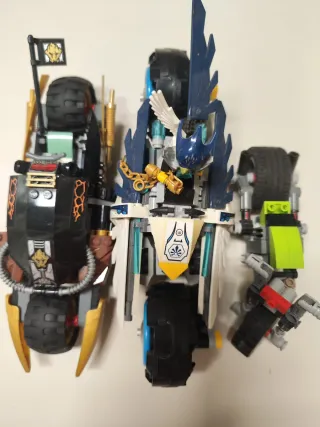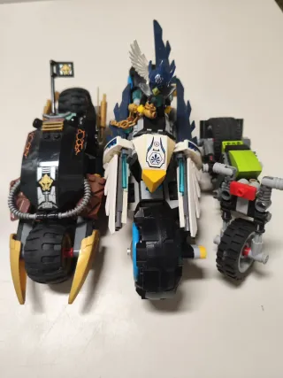 Set di modelli Lego raffiguranti 3 motociclette. - Veicolo nero con dettagli dorati e bandierina. - Veicolo bianco e blu con ali e figura di uccello. - Veicolo piccolo con dettagli verdi e rossi.