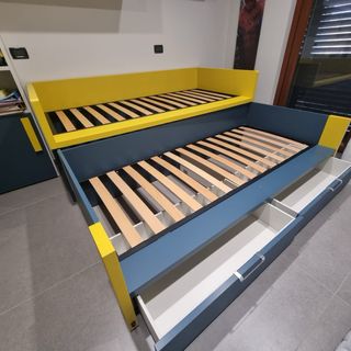 Letto per cameretta con struttura in legno e finiture colorate. - Struttura gialla. - Base blu con due ampi cassetti. - Doghe in legno per il materasso.